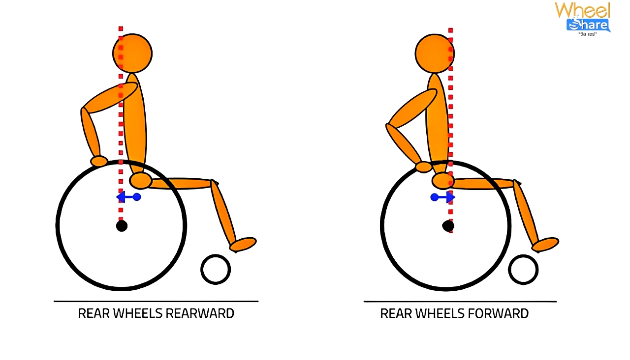 ถ้าล้อหลังอยู่ ถอยหลังมากเกินไป → จุดศูนย์ถ่วงจะเลื่อนไปข้างหน้า → ทำให้ล้อหน้ารับน้ำหนักมากขึ้น → เข็นยากขึ้น , หมุนยาก , footprint (รอยเท้า/รอยเข็น) ยาวขึ้น → แขนหนักขึ้น , เสี่ยงบาดเจ็บมากขึ้น.