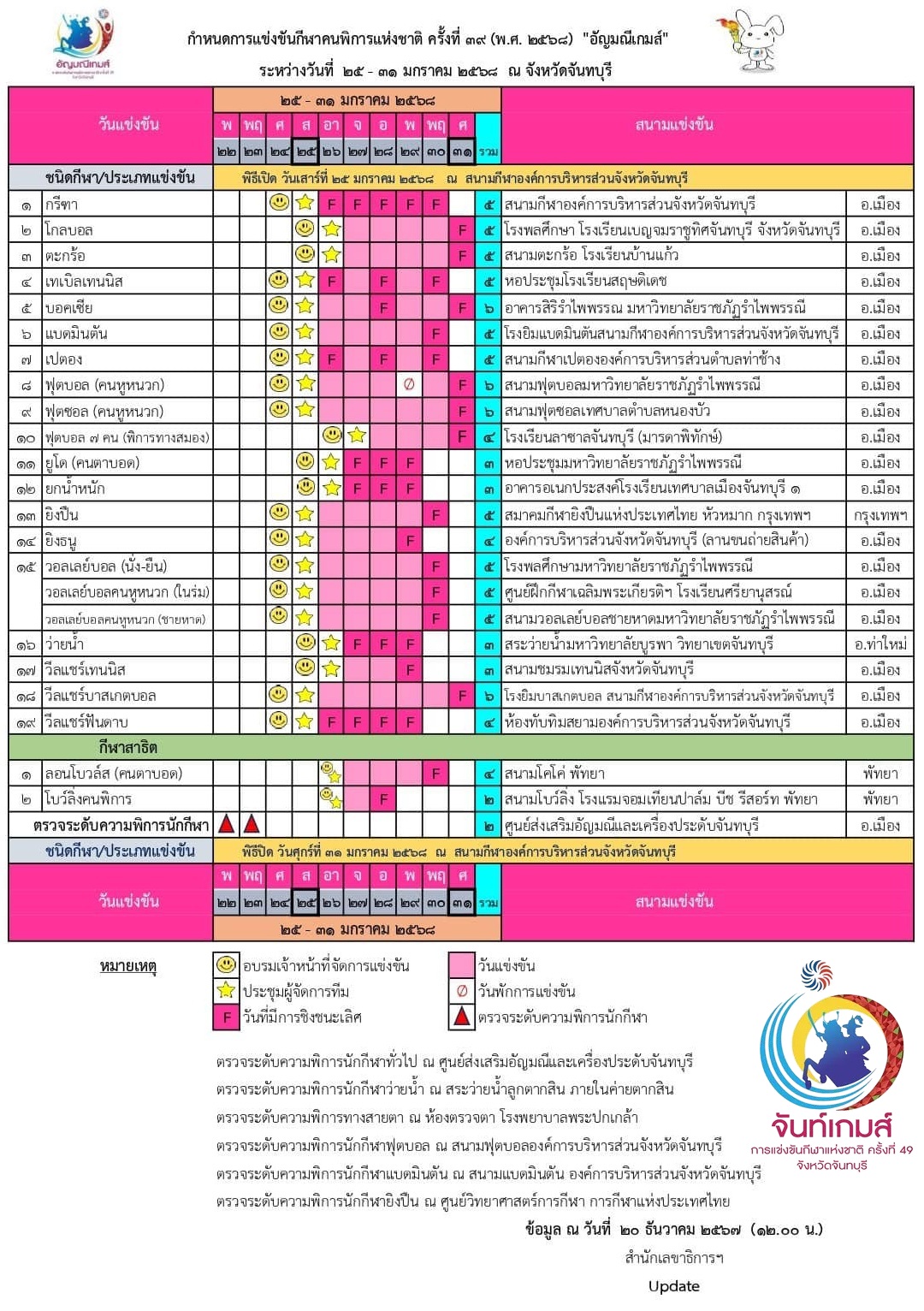 กีฬาคนพิการแห่งชาติ ครั้งที่ 39 มีชื่อว่า "อัญมณีเกมส์" กำหนดจัดขึ้นระหว่างวันที่ 25-31 มกราคม 2568 ณ จังหวัดจันทบุรี มีชนิดกีฬาที่ร่วมแข่งขัน 21 ชนิด มีสัญลักษณ์นำโชคชื่อ น้องอัญมณี และมีคำขวัญว่า "ความเท่าเทียมทางกีฬา มีมนต์ตราสานไมตรี"