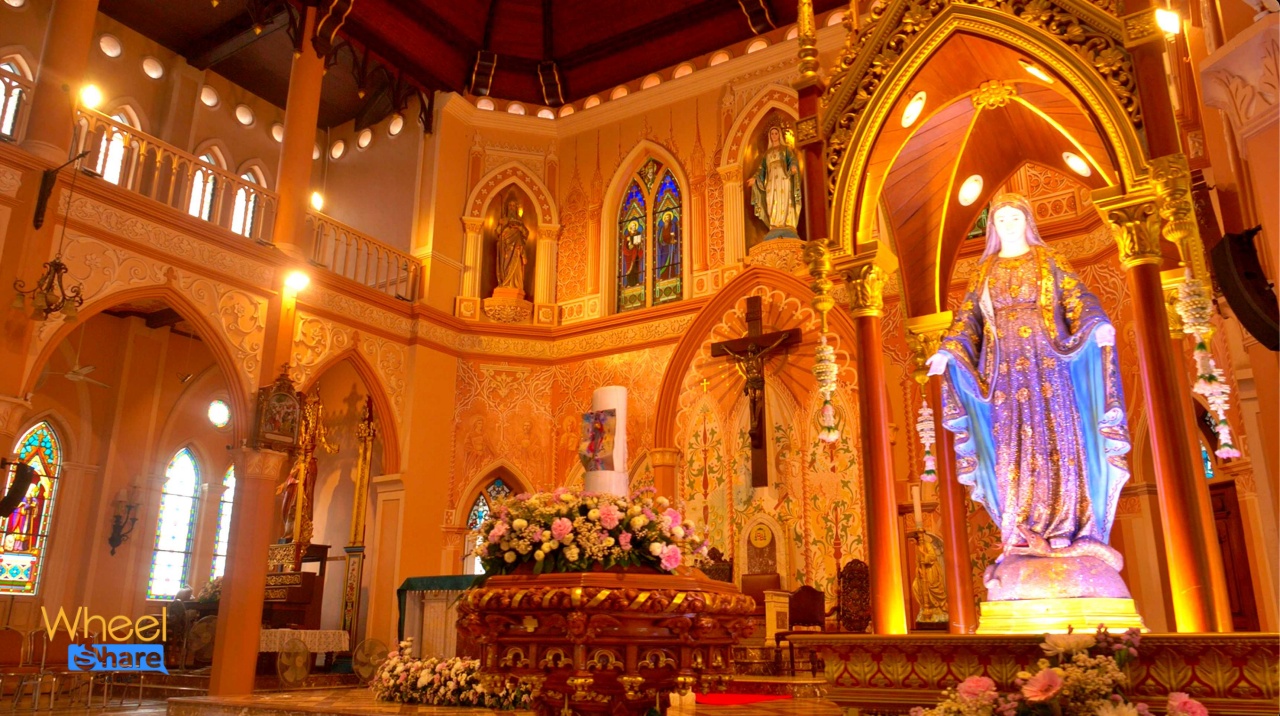 เมื่อเดินเข้าไปข้างในจะสัมผัสได้ถึงความสงบและศรัทธาอย่างลึกซึ้ง สิ่งที่โดดเด่นที่สุดคือ รูปปั้นแม่พระประดับพลอยมากถึง 2 แสนเม็ด หรือกว่า 2 หมื่นกะรัต มูลค่าสูงถึง 10 ล้านบาท ที่เปล่งประกายราวกับแสงดาว 🌟 บอกเลยว่าพอแสงแดดส่องเข้ามาในโบสถ์ผ่านกระจกสี (Stained Glass) ช่างอบอุ่นและสงบในหัวใจอย่างบอกไม่ถูกเลย 💗