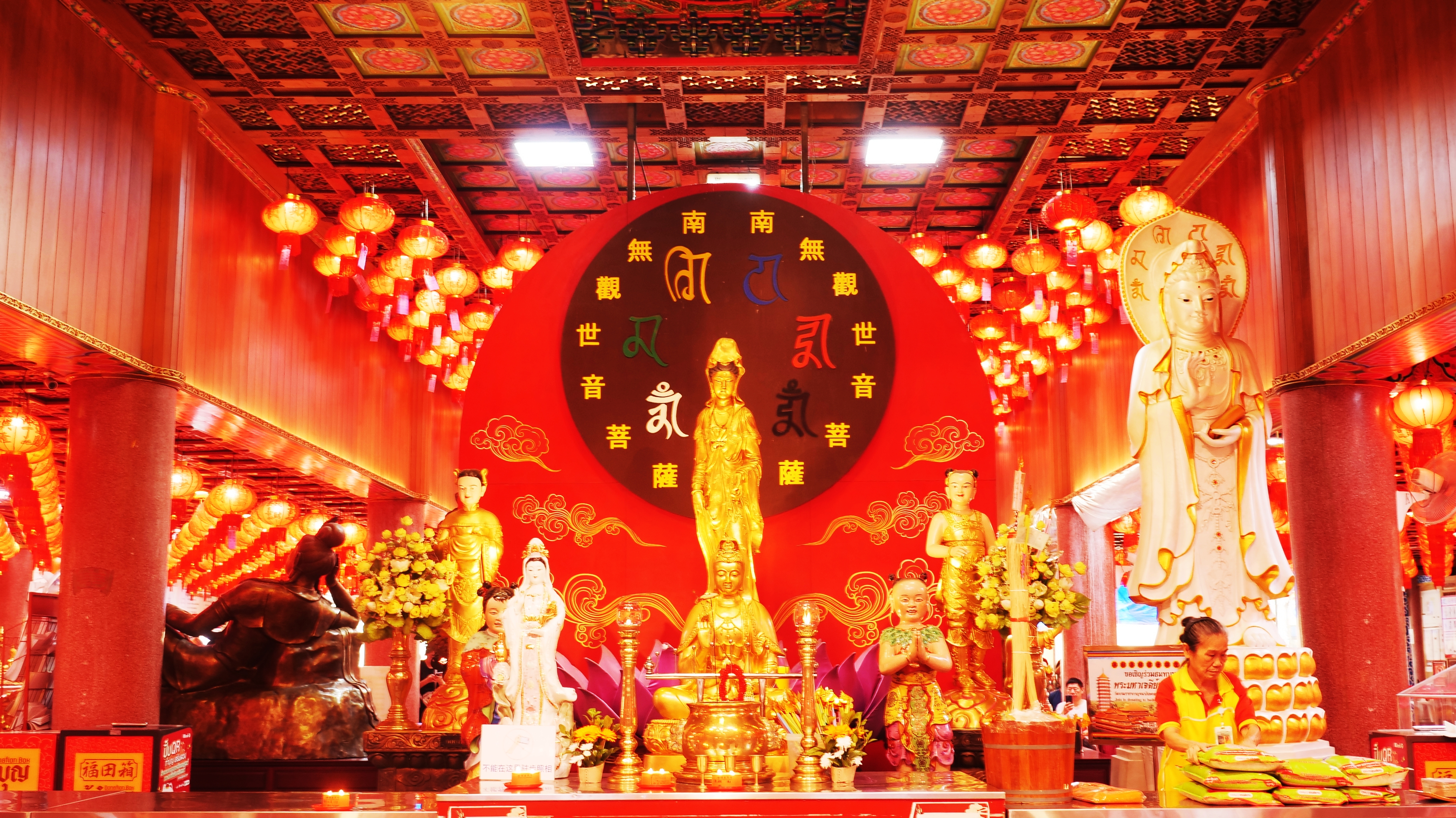 ภายในวัดมีการประดิษฐานเทพเจ้าและพระโพธิสัตว์หลากหลายองค์ เช่น พระกวนอิมโพธิสัตว์ และเทพเจ้าไท่ส่วยเอี๊ย ซึ่งผู้คนเชื่อว่ามีอิทธิพลต่อดวงชะตา ทำให้วัดนี้เป็นสถานที่ยอดนิยมสำหรับการแก้ปีชงและเสริมสิริมงคล บรรยากาศที่เงียบสงบและร่มรื่นด้วยต้นไม้มากมาย ทำให้การ