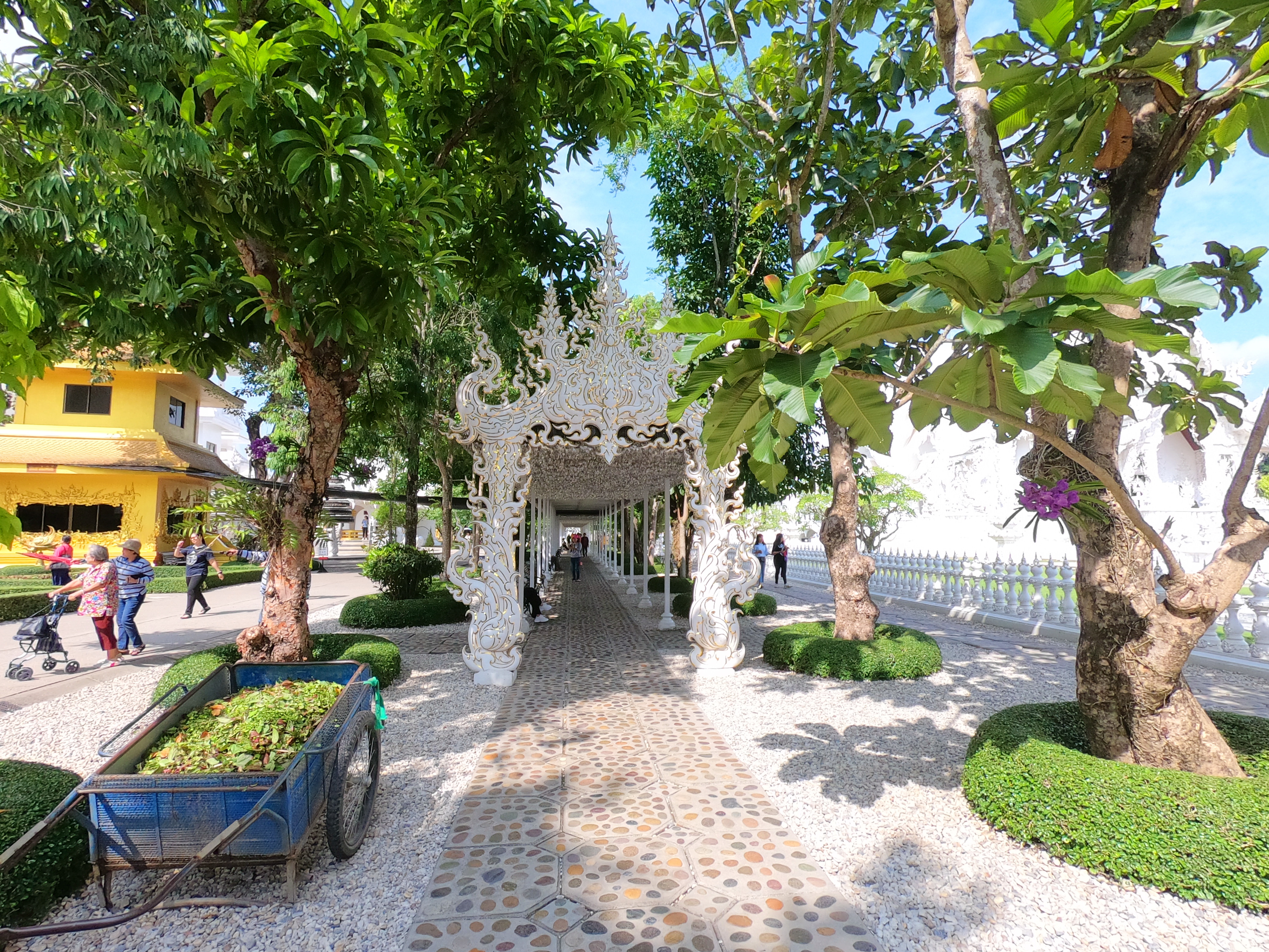 สะพานอุปสมบทที่นำไปสู่อุโบสถ สะพานที่ทอดยาวข้ามสระน้ำสีขาว เชื่อมต่อระหว่างอุโบสถและเจดีย์ เปรียบเสมือนการข้ามพ้นจากกิเลสและความทุกข์ใน "บ่อนรก" ไปสู่ความสงบและสว่างไสว